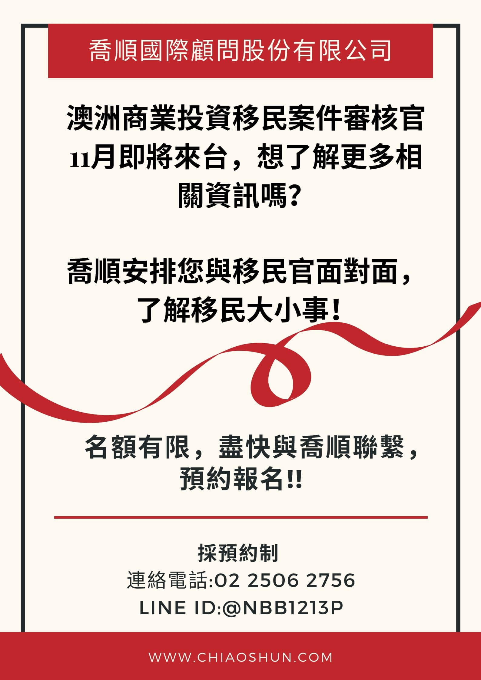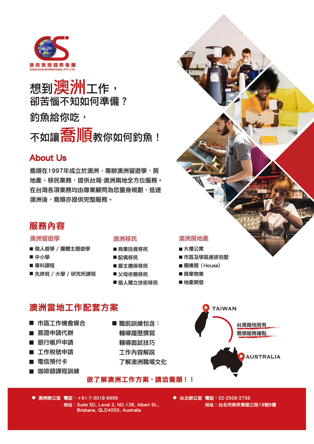 Filter Categories全部活動訊息留遊學訊息移民訊息 2026-03-26 澳洲中小學留學成功案例 - 從高中Citipointe Christian College到大學The University of Melbourne 了解更多 2026-03-26 澳洲中小學讓我快樂學習,輕鬆取得澳洲中學ATAR 99.1分! 了解更多 2025-03-10 2026 澳洲暑假遊學 (Shafston, Browns, Imagine) 了解更多 2025-02-27 澳洲中小學及留學經歷分享 - 從澳洲中小學John Paul College到澳洲大學 了解更多 2025-02-18 澳洲留學經歷分享 - 從高中Citipointe Christian College到大學RMIT University 了解更多 2025-01-15 熱門課程介紹 會計課程 了解更多 2025-01-15 熱門課程介紹 IT課程 了解更多 2025-01-15 熱門課程介紹 汽修課程 了解更多 2025-01-15 熱門課程介紹 餐飲系列課程 了解更多 2025-01-15 熱門課程介紹 土木工程課程 了解更多 2025-01-15 熱門課程介紹 木工課程 了解更多 2023-04-28 留學澳洲-昆州有7所大學被評選為全澳最幸福的學校! 了解更多 2023-04-26 移民體系改革最新消息及關注的議題 了解更多 2022-11-30 澳洲畢業生工作簽證_有望再次延長簽證期限,最多六年! 了解更多 2022-03-28 澳洲投資移民2023-2024全指南》了解澳洲移民門檻條件與常見問題 了解更多 2020-07-22 移民澳洲 取到永久居留身份就等於是澳洲公民嗎? 了解更多 2020-05-12 澳洲留學 熱門課程介紹-商用飛行機師課程 了解更多 2020-05-06 澳洲留學 熱門課程介紹 飛機維修課程 了解更多 2020-03-30 移民台灣 港澳專業人士移民台灣條件 了解更多 2020-03-19 移民資訊 491簽證-小型企業主的移民捷徑 了解更多 2020-03-02 簽證小教室: 407 職業培訓簽證 / 407 Training Visa 了解更多 2020-03-02 移民資訊 FNQ DAMA 了解更多 2019-10-14 昆士蘭大學 先修班IES 獎學金 了解更多